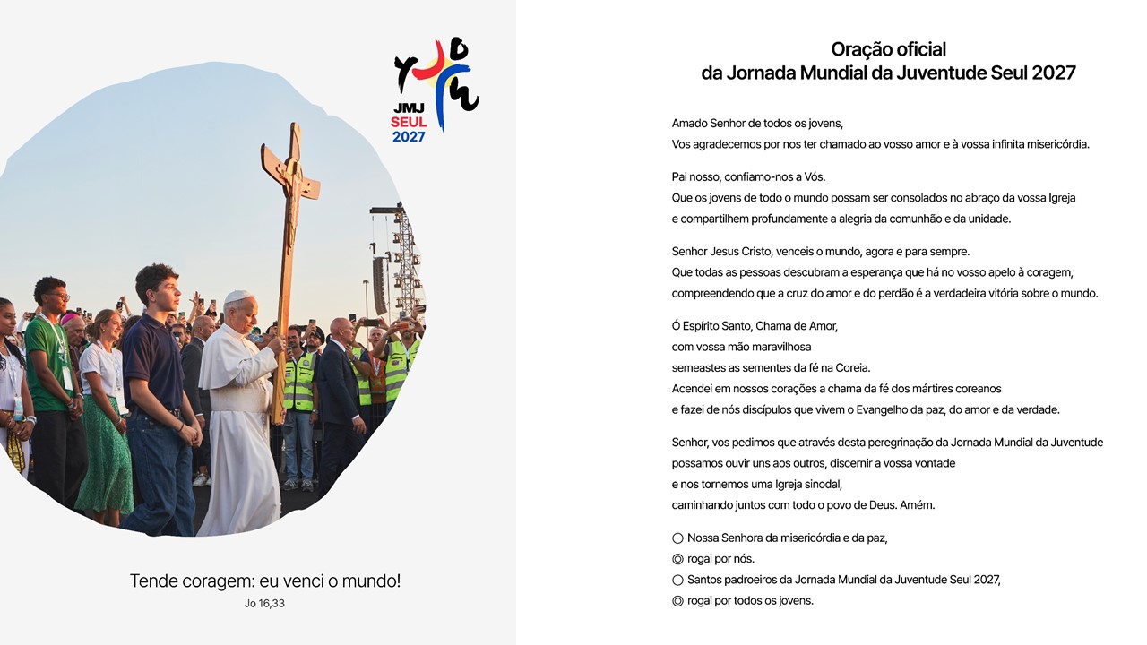 O Comitê Organizador Local (COL) da Jornada Mundial da Juventude (JMJ) Seul 2027 publicou a oração oficial que acompanhará os jovens e toda a Igreja na peregrinação rumo à próxima Jornada Mundial da Juventude. A oração é divulgada na Solenidade de Cristo Rei como um convite espiritual para que a Igreja global comece a se preparar para o encontro de 2027.